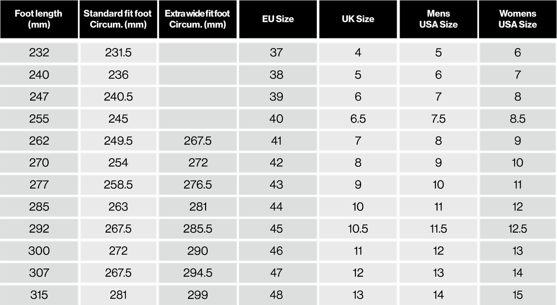uvex multiple fit system offers multiple widths in the same length in core sizes. Fitting widths are based on the measurement of the widest part of the foot. Measurement is taken of the circumference of the foot at the base joint of the big toe and the joint at the base of the little toe. This will determine the required shoe width in combination with foot length